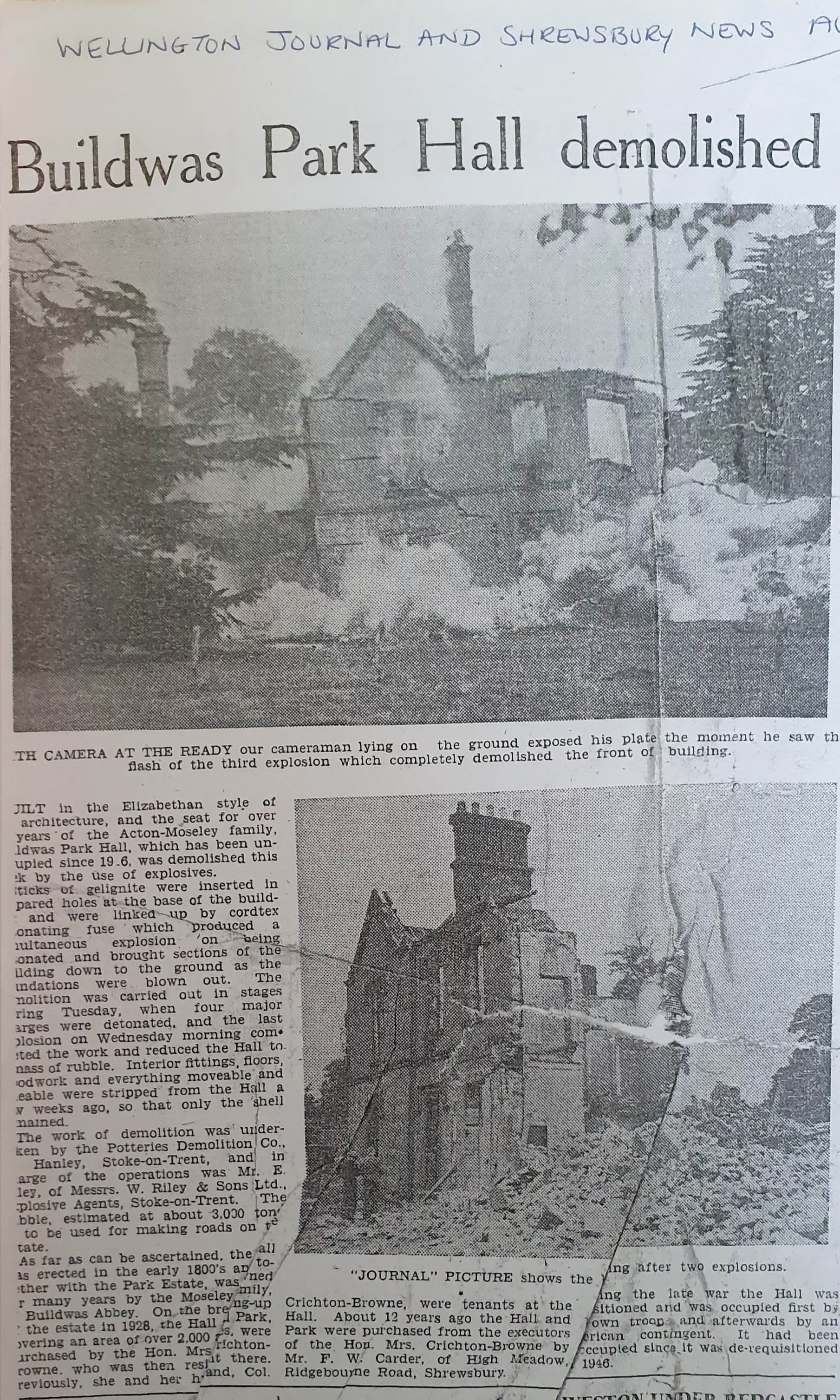 Buildwas Park Hall was taken over in the Second World War as a searchlight battery to protect the Ironbridge Power Station. It was unoccupied from 1946 and demolished in 1957 because during the requisition the house was physically unrestorable or unable to be economically repaired.