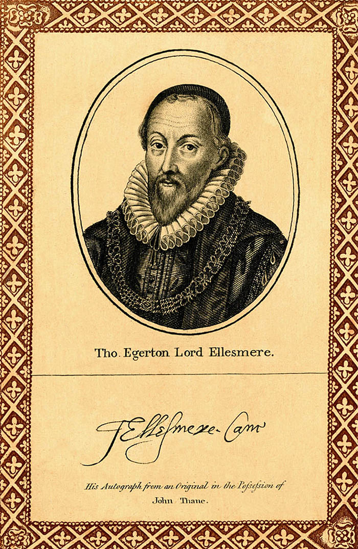 Sir Thomas Egerton (1st Viscount Brackley, Lord Ellesmere) born in 1540 in Cheshire, he was the illegitimate son of Sir Richard Egerton and an unmarried woman named Alice Sparks, he was acknowledged by his family and educated at Oxford, he became a barrister. After Queen Elizabeth the 1st saw him plead a case against the crown he was made Queens Counsel . In 1579 he was made Master of the Bench of Lincolns Inn, in 1581 he was appointed Solicitor General, he married Elizabeth Ravenscroft and fathered two sons and a daughter. His first wife died, and he married a widow, Elizabeth Walley. He bought Tatton Park in 1598. Elizabeth died at the beginning of 1600, he then married Alice Stanley , nee Spencer, he left the estate to his son John.